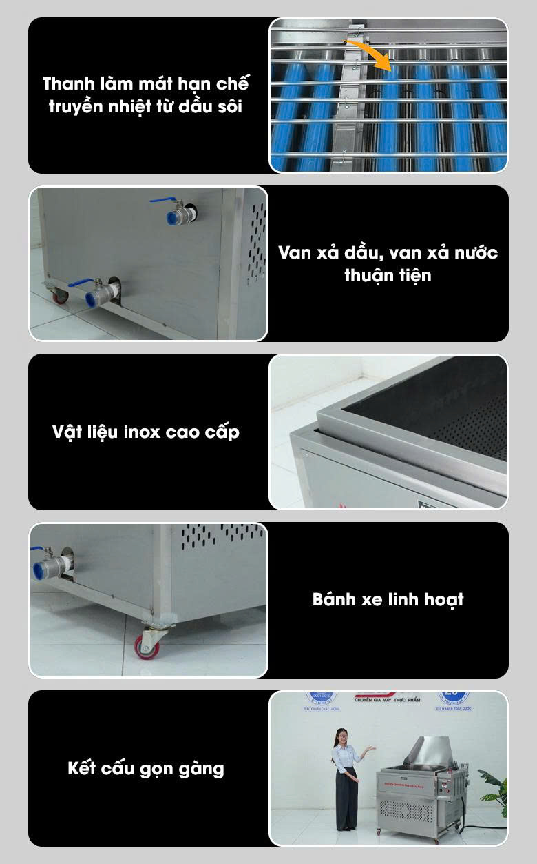 Người vận hành có thể dễ dàng đưa lượng lớn thực phẩm, nguyên liệu vào chiên và lấy ra sau khi đã chiên xong mà không cần tiếp xúc gần với dầu sôi, giảm nguy cơ tai nạn lao động xuống mức thấp nhất.