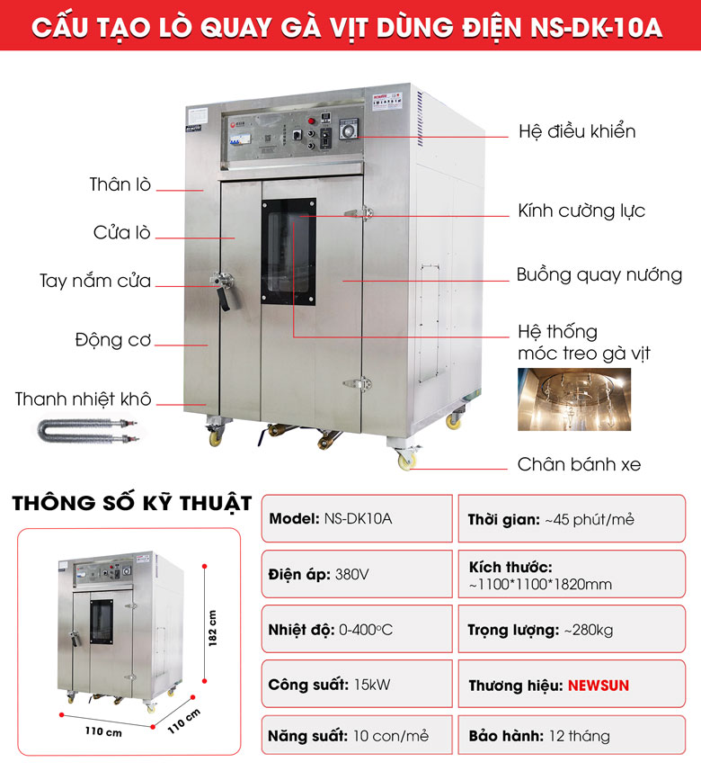 Lò quay gà vịt dùng điện là một trong những dòng máy chế biến thực phẩm hiện đại, là xu thế sử dụng để quay nướng gà vịt, ngan, ngỗng,…hiện nay. Nếu bạn đang có ý định mua lò quay gà vịt dùng điện NS-DK10A, NEWSUN là một lựa chọn đáng tin cậy.