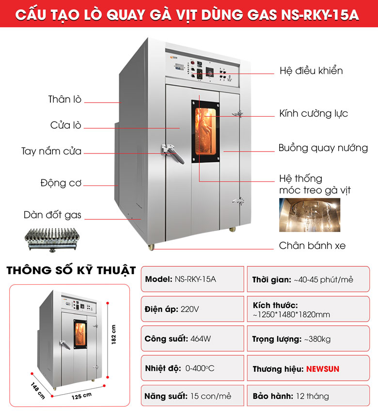 Lò quay gà vịt dùng gas NS-RKY-15A là một trong những dòng lò quay hiện đại nhất hiện nay, mang đến sự tiện ích cho người kinh doanh. Nếu bạn đang tìm mua sản phẩm này thì NEWSUN là một lựa chọn của khách hàng thông thái. Lý do bởi: