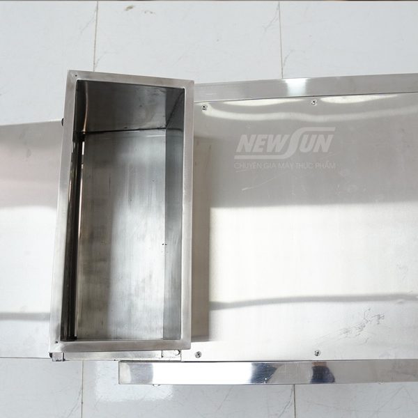 Khoang tiếp nguyên liệu được thiết kế phẳng với độ nghiêng dốc vừa phải, mục đích để khối thịt tự trượt xuống bộ phận lưỡi dao và chặt thái tự động theo quy trình: khoang chứa -> bộ lưỡi dao -> thành phẩm rơi xuống khay đựng bên dưới.