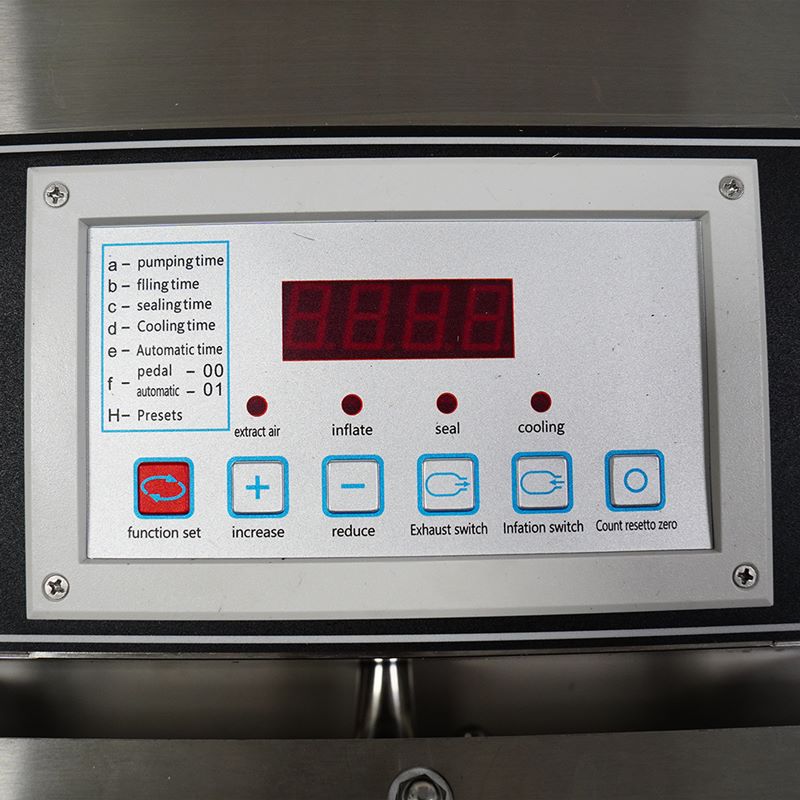 Máy tích hợp đầy đủ các chức năng như hút chân không, thổi khí, tăng/giảm thông số và lựa chọn chế độ, giúp tối ưu quy trình đóng gói nhanh chóng và hiệu quả.