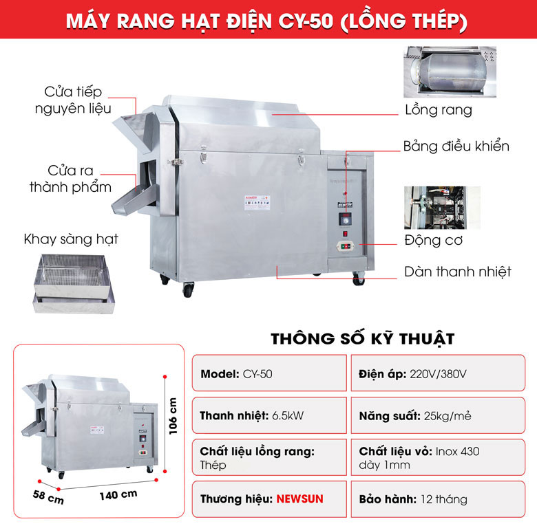 Máy rang hạt CY-50 dùng điện được NEWSUN trực tiếp nhập khẩu và phân phối tới khách hàng, không qua trung gian nên đảm bảo chất lượng và mức giá phù hợp nhất.