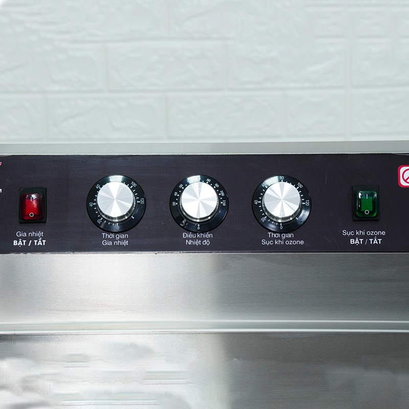 Trên mỗi bảng điều khiển đều có công tắc bật/tắt gia nhiệt, núm vặn cài đặt thời gian làm nóng nước (0 – 90 phút) và núm vặn điều chỉnh nhiệt độ (0 – 110°C). Ngoài ra, người dùng có thể chủ động bật hoặc tắt sóng siêu âm ở khoang rửa, cũng như bật/tắt hệ thống sục khí ở khoang tráng thông qua công tắc riêng, kết hợp với núm vặn điều chỉnh thời gian hoạt động cho từng chức năng.