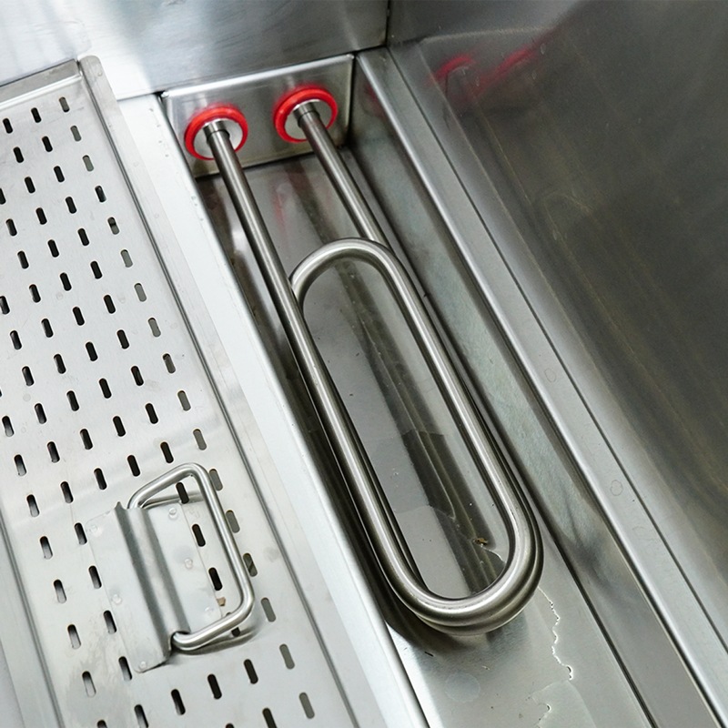 – Thanh nhiệt chữ U kép công suất 3kW giúp làm nóng nước nhanh chóng, hỗ trợ hòa tan dầu mỡ hiệu quả hơn, từ đó giảm lượng hóa chất cần sử dụng trong quá trình rửa.