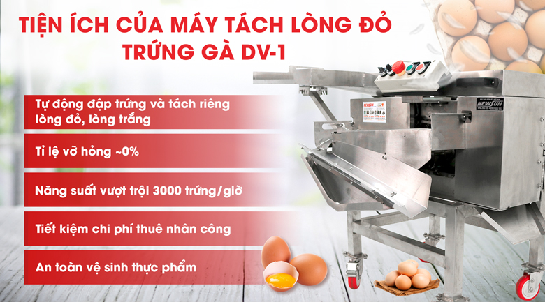 Để giúp các cơ sở giảm chi phí hàng tháng, làm tăng hiệu quả kinh doanh và tối ưu lợi nhuận, NEWSUN đem đến giải pháp tách lòng đỏ trứng hiện đại bậc nhất hiện nay => Máy Tách Lòng Đỏ Trứng DV-1. Máy giúp tách riêng lòng đỏ và lòng trắng trứng gà một cách nhanh gọn, không bị nát và đảm bảo vệ sinh an toàn thực phẩm.
