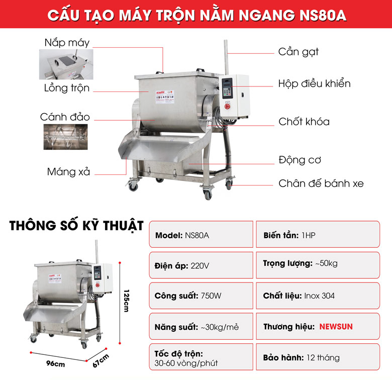 - 2 Đặc điểm, tính năng nổi bật của máy trộn nằm ngang NS80A