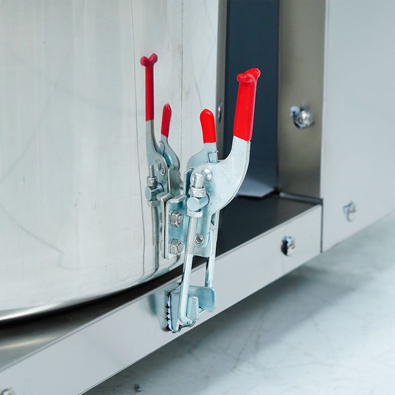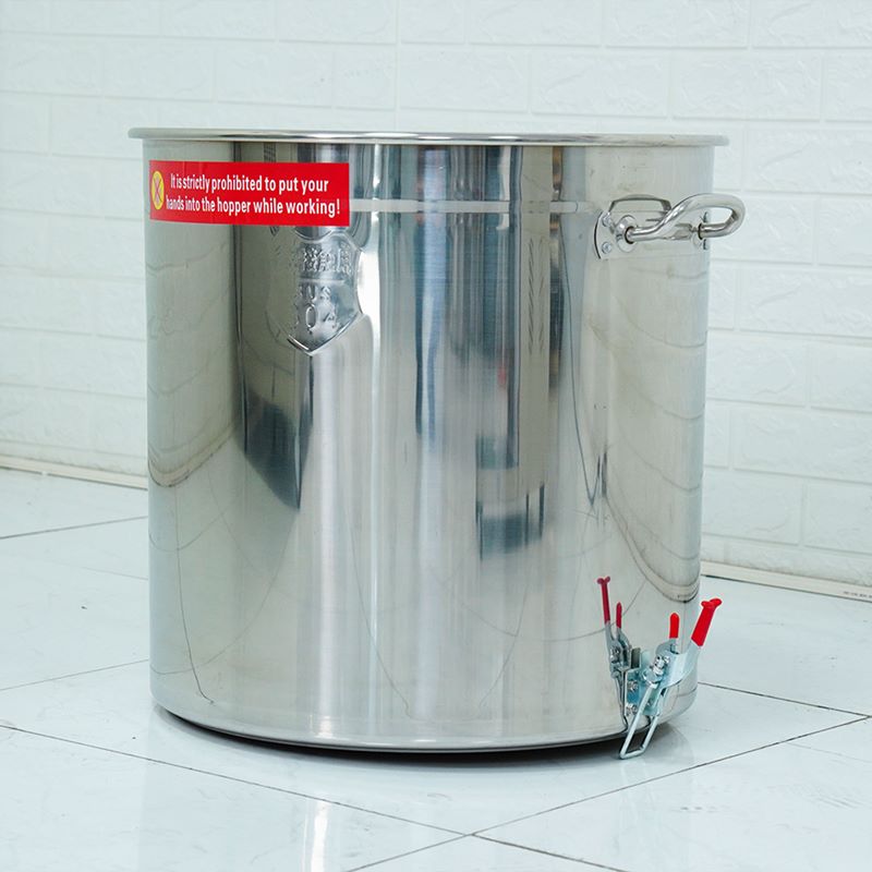Tay cầm được thiết kế vừa vặn, hỗ trợ nâng nhấc an toàn và thuận tiện ngay cả khi thùng chứa đầy nguyên liệu. Phần nắp thùng có khóa cài chắc chắn, giúp hạn chế tình trạng nguyên liệu văng ra ngoài, giữ khu vực làm việc sạch sẽ và đảm bảo an toàn khi vận hành.