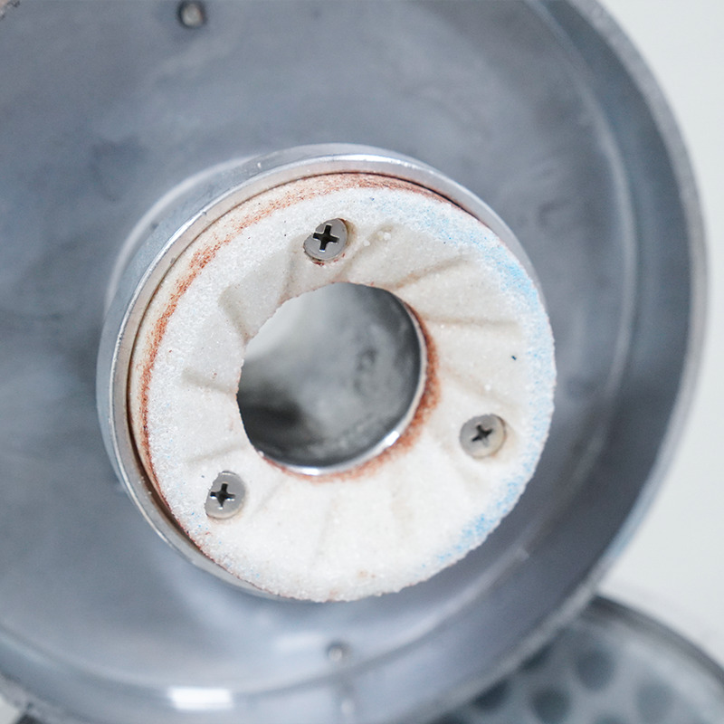 Thiết bị sử dụng đá nghiền trắng có độ cứng cao, giúp tạo lực ép ổn định trong quá trình xay, từ đó giúp đậu được nghiền mịn hơn.
