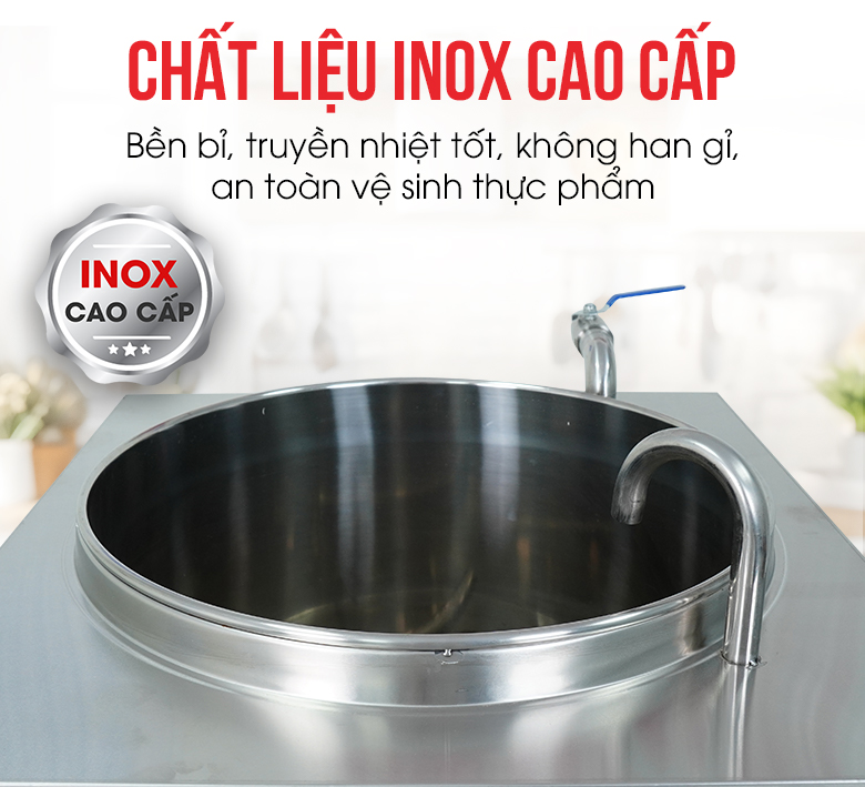 Chất liệu bền bỉ: Nồi nấu được làm hoàn toàn từ inox cao cấp, đảm bảo độ bền cao, chống han gỉ và an toàn thực phẩm.