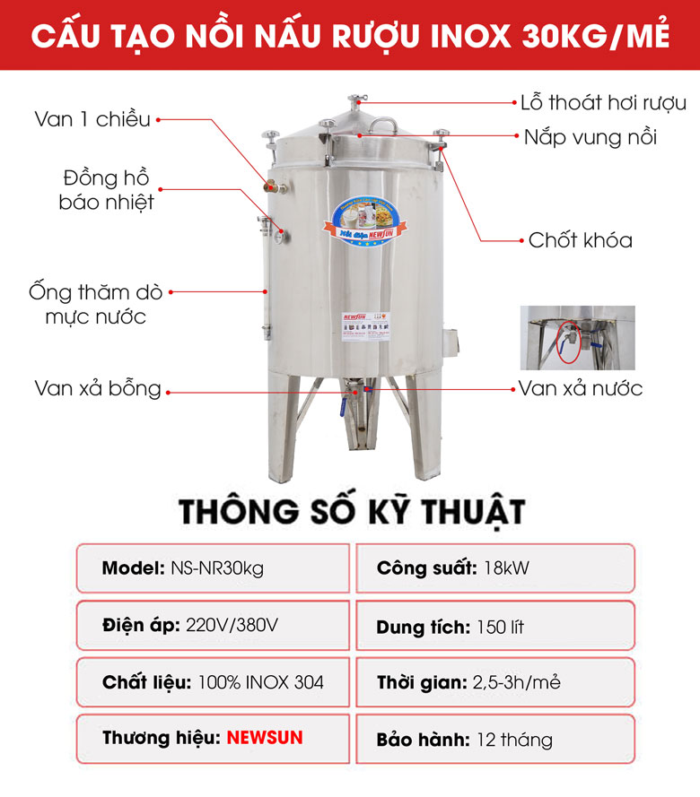 Nồi nấu rượu inox 30kg/mẻ thuộc dòng nồi nấu rượu inox dùng điện hiện đại, cách vận hành vô cùng đơn giản, giúp bạn tiết kiệm tối đa thời gian và công sức. Với năng suất 30kg cơm rượu mỗi mẻ, nồi đáp ứng tốt nhu cầu của các hộ gia đình nấu rượu quy mô nhỏ.