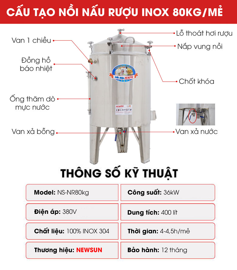 Nồi nấu rượu inox 80kg/mẻ chính hãng sản xuất được nghiên cứu thiết kế tối ưu để mang tới hiệu quả cao nhất trong quá trình sử dụng.