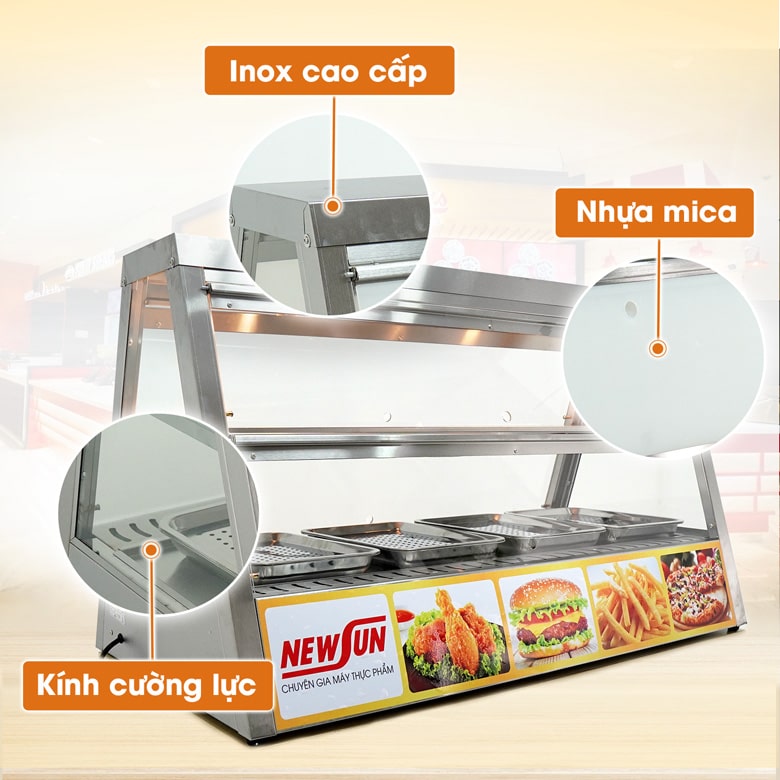 Tủ giữ nóng thức ăn NEWSUN nổi bật với các mặt kính cường lực và nhựa mica cực dày, có khả năng cách nhiệt tốt, chịu được nhiệt độ cao, chống nứt vỡ trong thời gian dài. Kết hợp với đó là khung máy inox cao cấp chắc chắn, đồng thời chống gỉ sét tốt giúp kéo dài tuổi thọ.