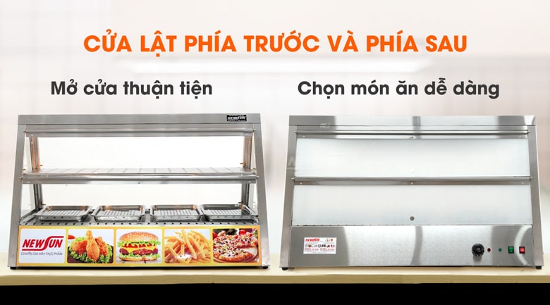 Đặc biệt, 2 mặt trước và mặt sau của tủ được thiết kế dạng cửa lật. Điều này đã đem tới sự tiện lợi cho người dùng và khách hàng vì có thể thoải mái mở cửa chọn món ăn.